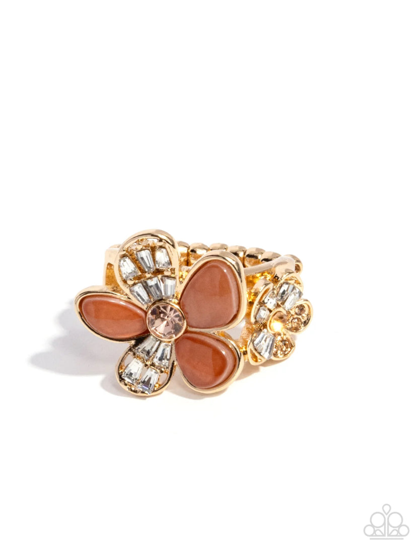 Two gold flowers bloom across the finger, each adorned with radiant details. One flower features brown shell-like and white baguette-cut rhinestone petals and a sparkling peach rhinestone center, while the smaller flower is encrusted with baguette-cut rhinestones and dainty light topaz gems for extra shimmer. Features a stretchy band for a flexible fit.
