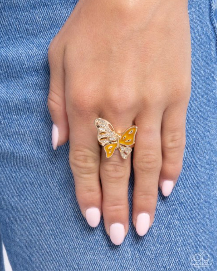 Dotted with white rhinestones on particular wings, an airy gold yellow-painted butterfly flutters atop the finger from airy gold bands for a whimsical pop of color. Features a stretchy band for a flexible fit.
