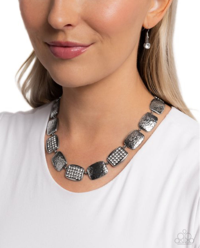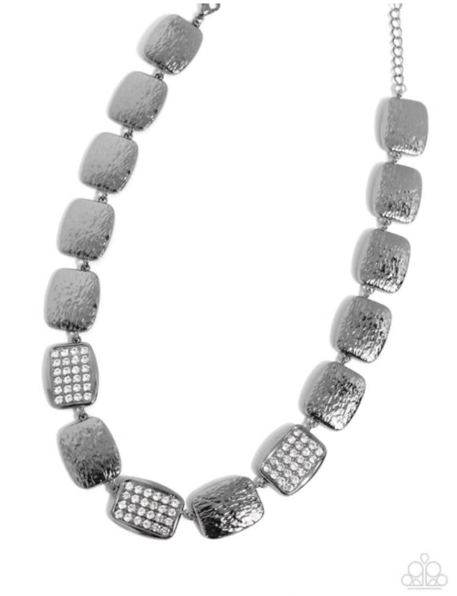 Interlocking below the neckline, a collection of hammered silver rounded rectangular discs alternate with glistening white rhinestone-embellished silver rectangular discs for a brilliantly bold display. Features an adjustable clasp closure.