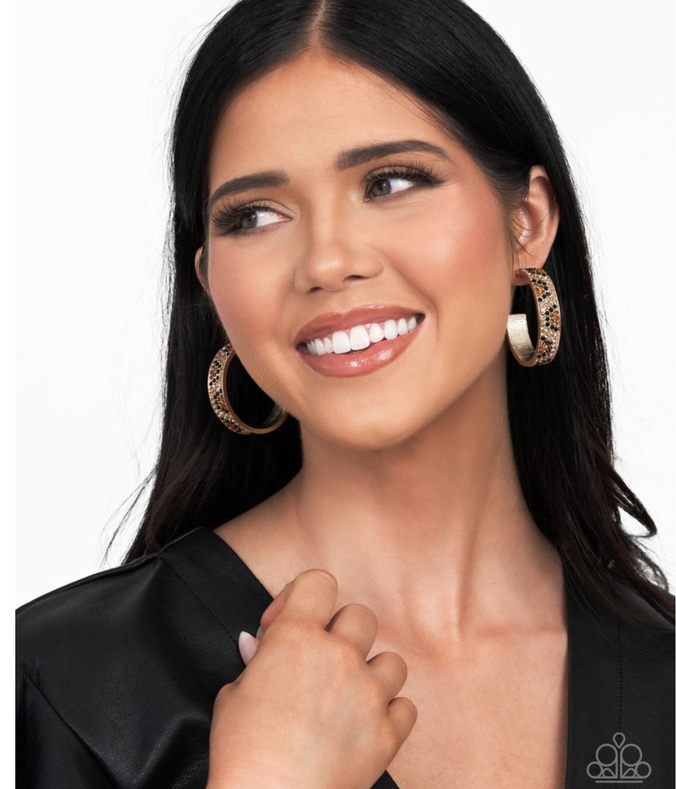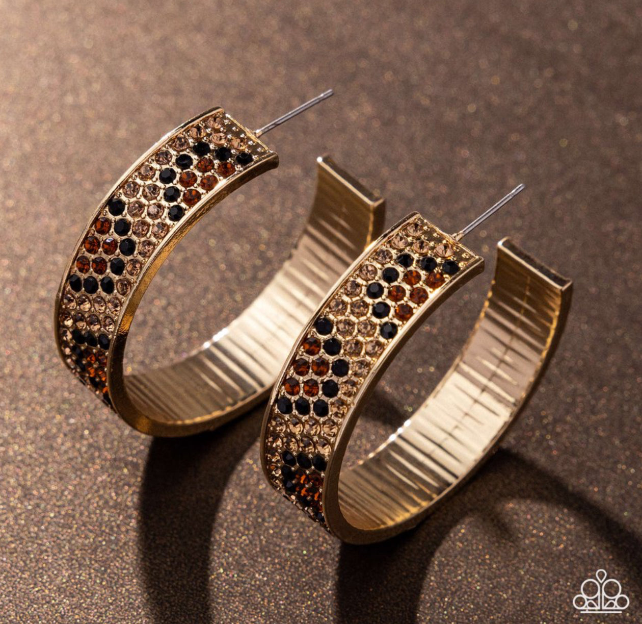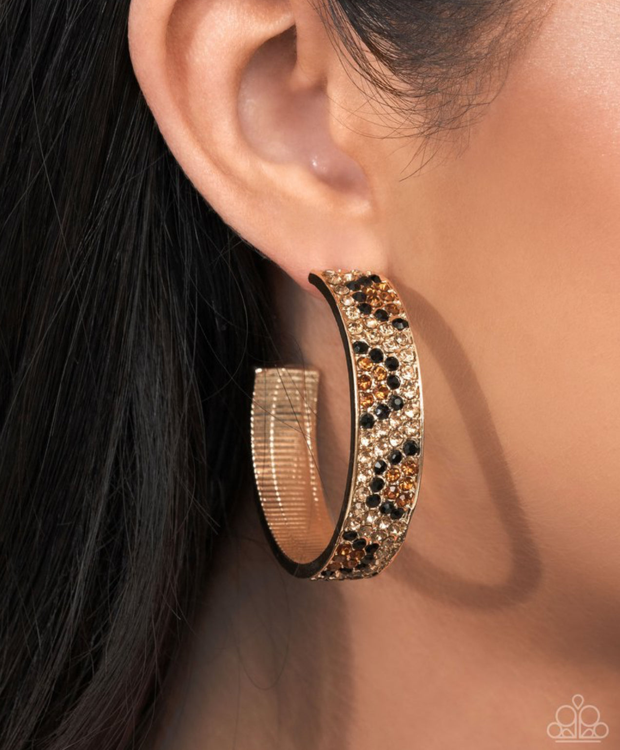 Set along the front of a thick gold hoop, black, tea, and light topaz rhinestones are embellished in a cheetah-inspired pattern for a wondrously wild look. Earring attaches to a standard post fitting. Hoop measures approximately 1 3/4" in diameter.