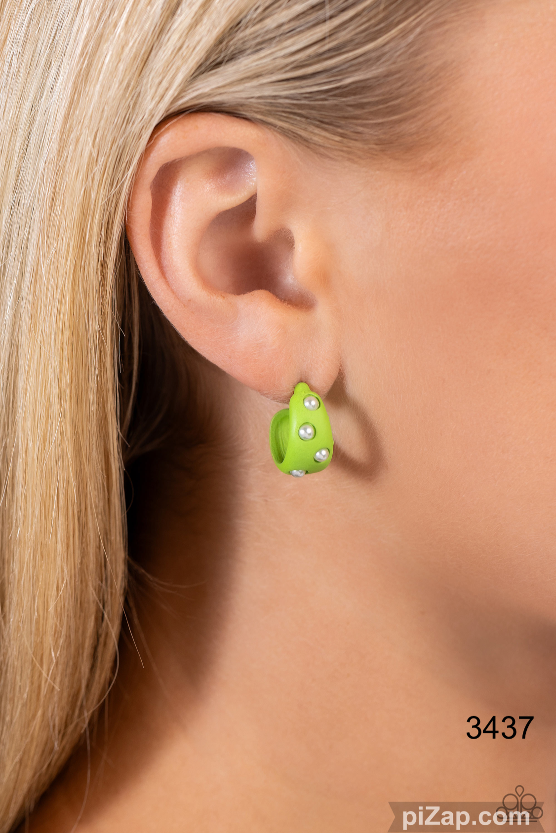 Encased in a Persian Jewel acrylic backdrop, dainty white pearls curl around the ear for a refined display with a bold splash of color. Earring attaches to a standard post fitting. Hoop measures approximately 1/2" in diameter.