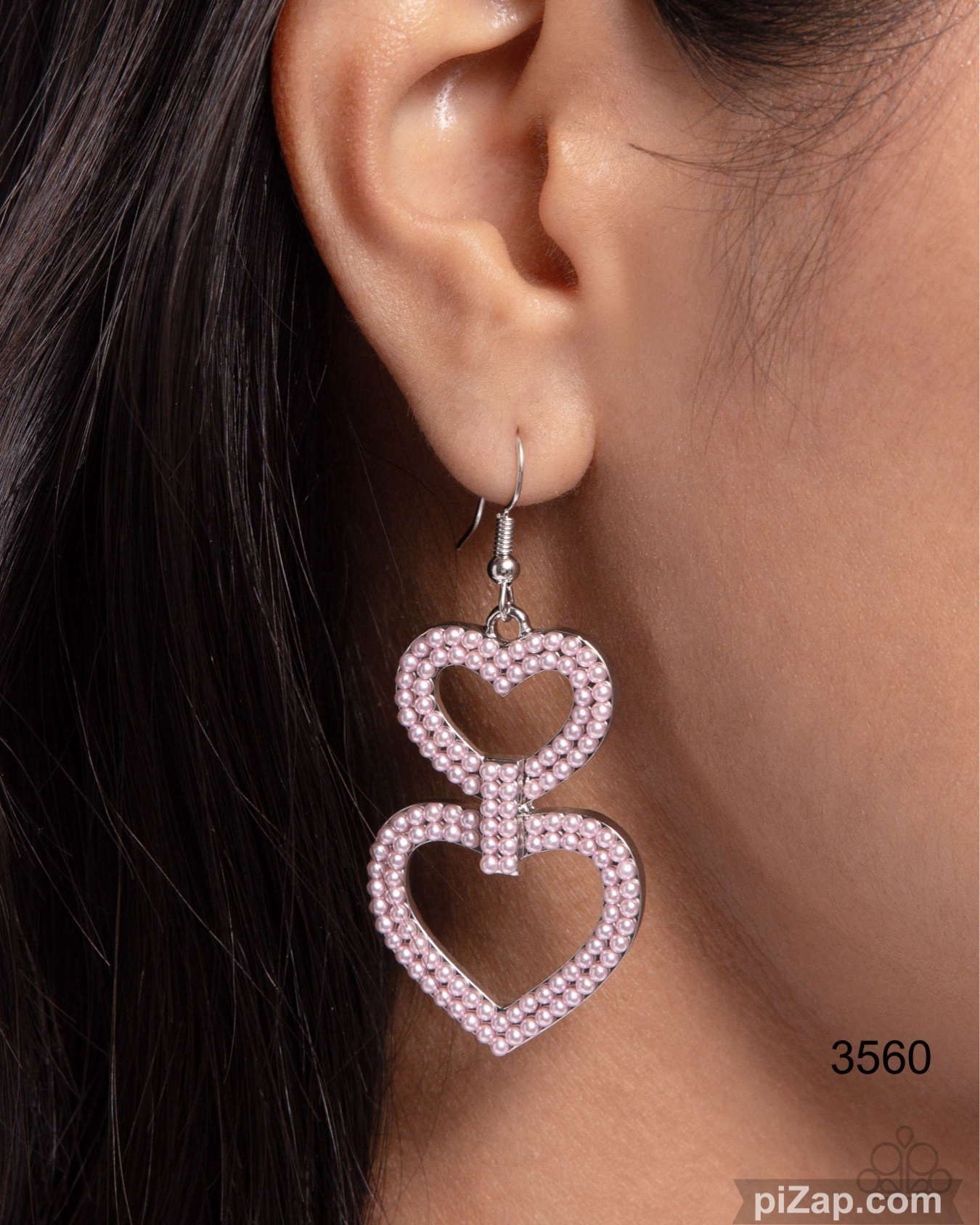 Pressed in interlocked silver heart frames of varying sizes and embellished atop the interlocking clasp itself, a doubled row of dainty baby pink pearls glistens below the ear for a delightfully darling look. Earring attaches to a standard fishhook fitting.