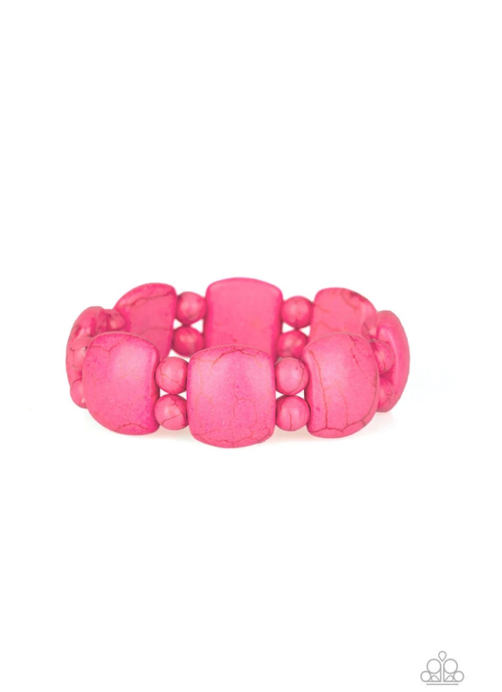 A collection of round and square-like pink stones are threaded along stretchy bands around the wrist for a seasonal look.