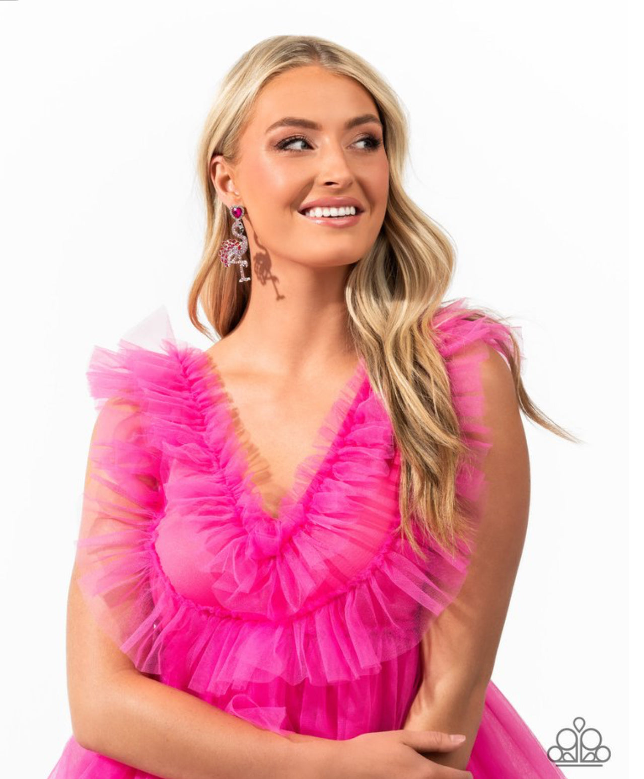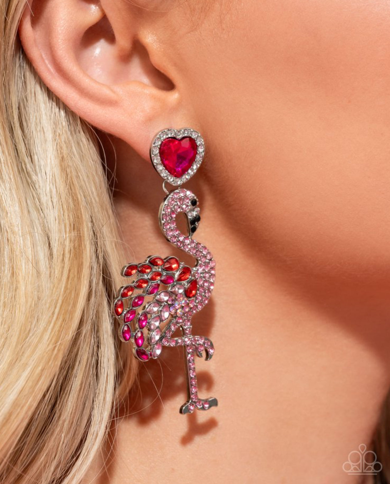 Pressed in a white rhinestone-dusted border, a fuchsia heart gem glistens from the ear, giving way to a silver flamingo post embellished in light rose, black, and white rhinestones, coalescing along the head and body. Red, fuchsia, and light rose gems and iridescent light rose rhinestones create the tail feathers of the flamingo for a flashy flair. Earring attaches to a standard post fitting. Due to its prismatic palette, color may vary.