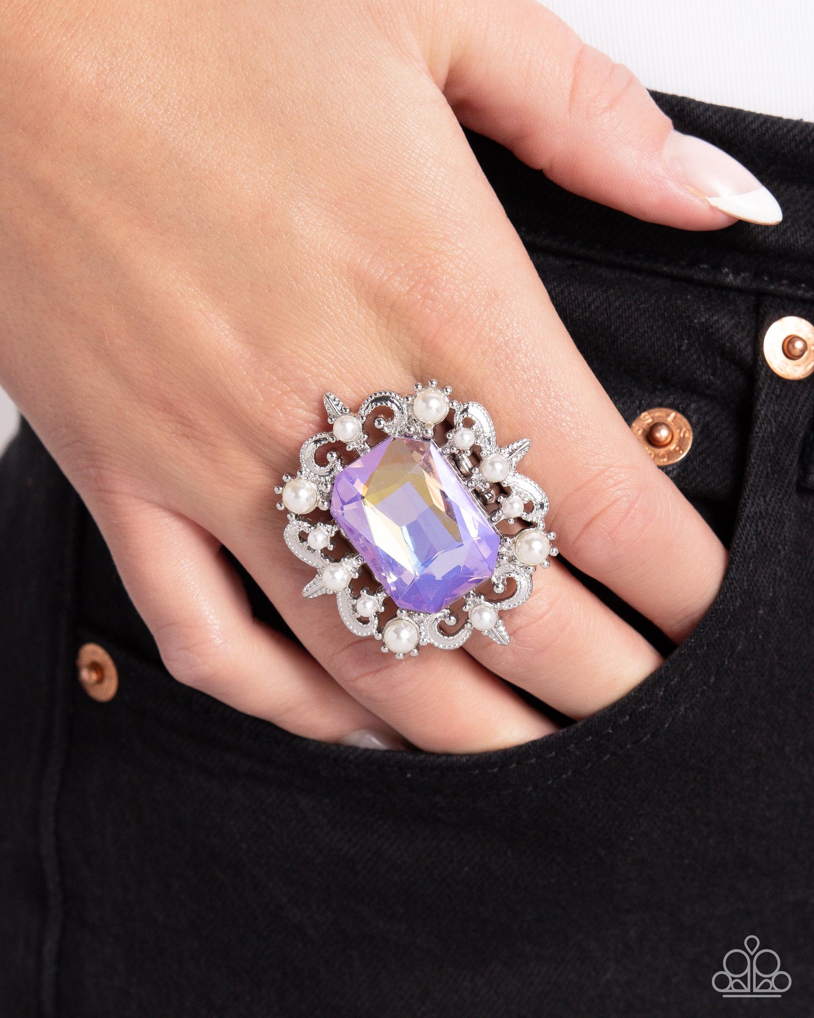 Pressed into an airy, whimsical, silver filigree frame, dotted with glossy white pearls, an emerald-cut purple UV shimmery gem creates a fairy tale-inspired centerpiece atop the finger. Features a stretchy band for a flexible fit.