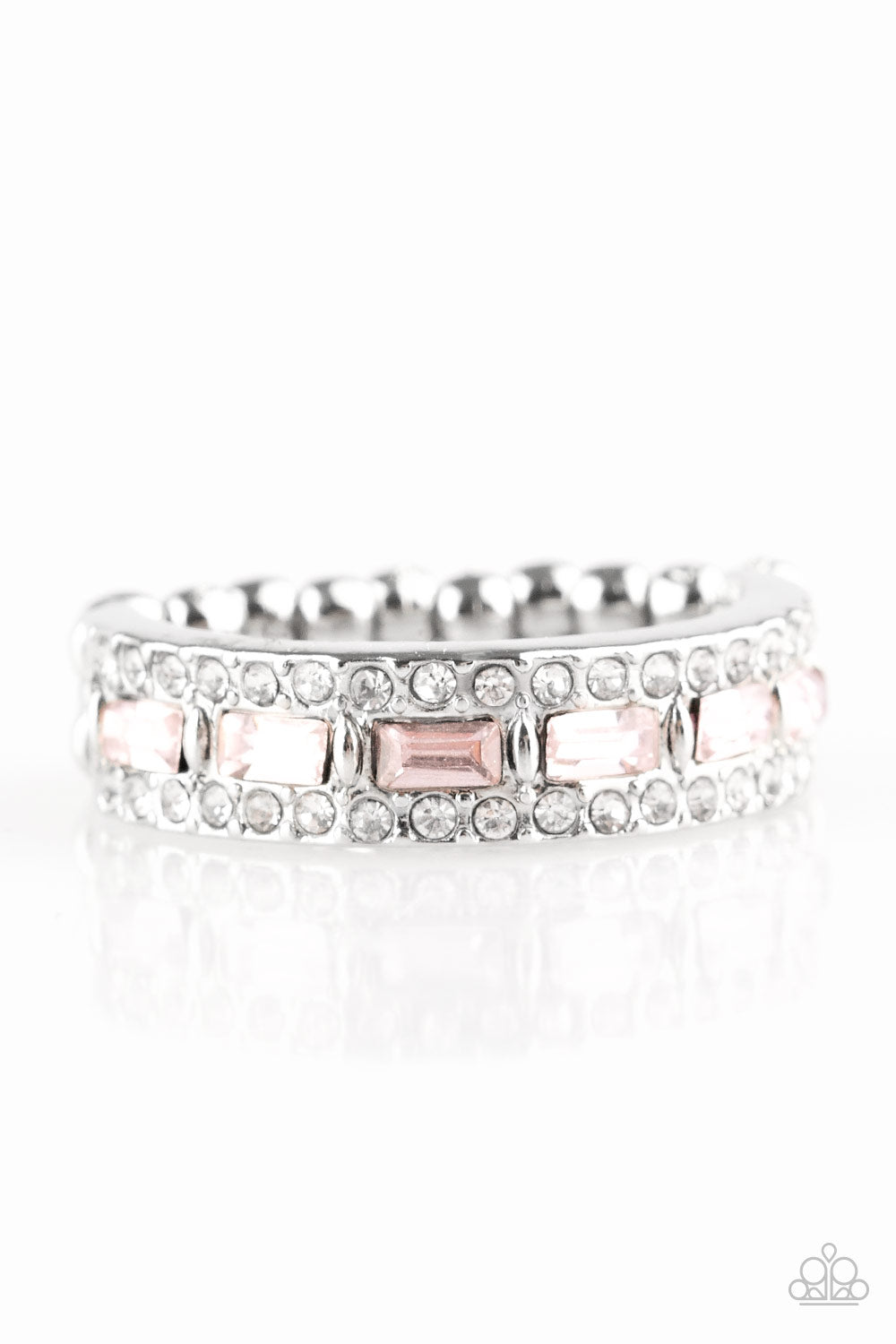 Featuring classic round and regal emerald style cuts, glassy white and glittery pink rhinestones are encrusted along a dainty silver band for a refined look. Features a dainty stretchy band for a flexible fit.