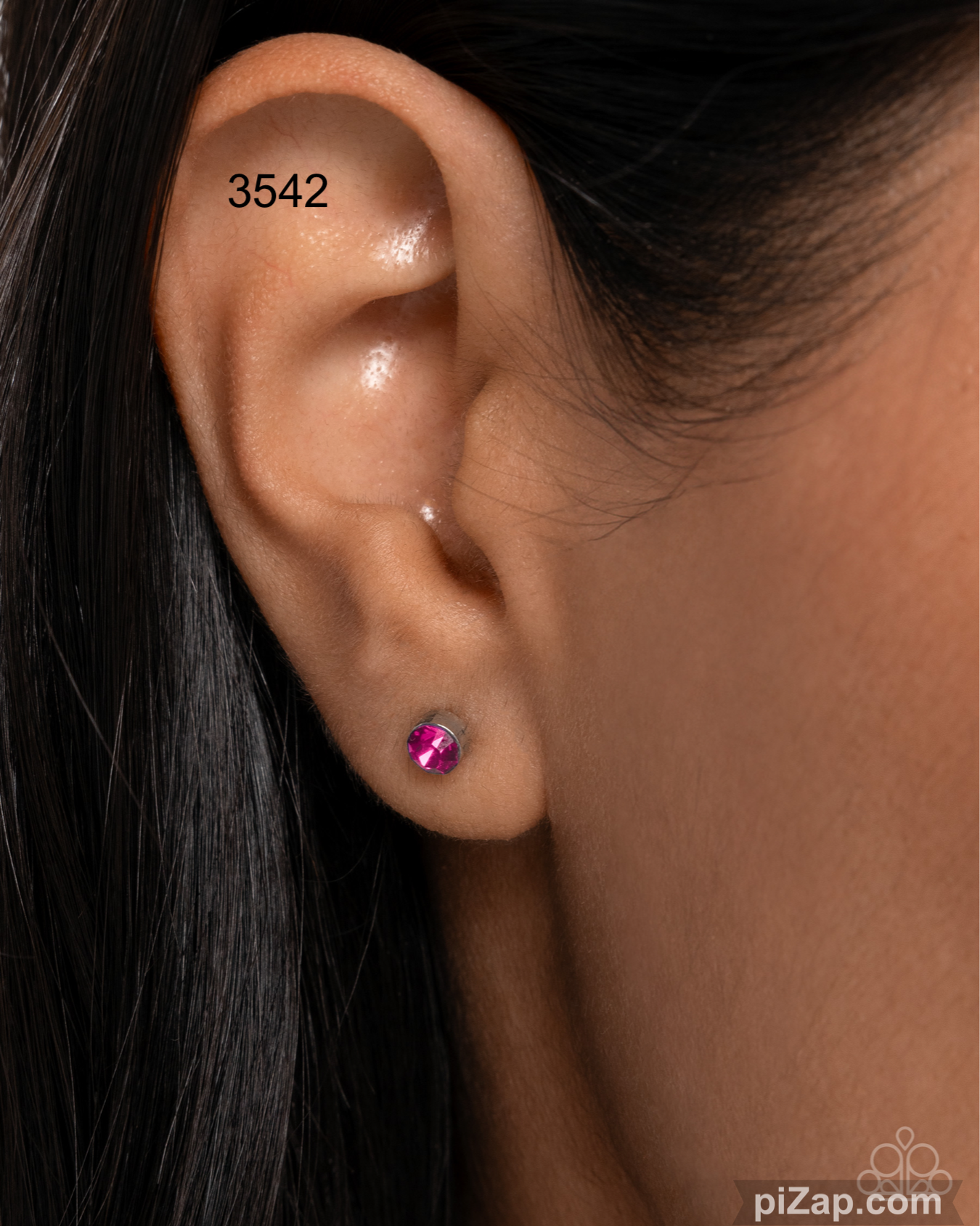 A dainty faceted fuchsia rhinestone is nestled inside a classic silver fitting for a light-catching look. Earring attaches to a standard post fitting.