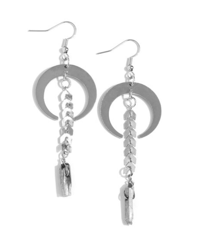 Delicately cascading from a silver laurel chain, a chiseled oil spill dipped stone swings from the bottom of a shiny silver crescent-shaped hoop, creating a seasonal lure. Earring attaches to a standard fishhook fitting.