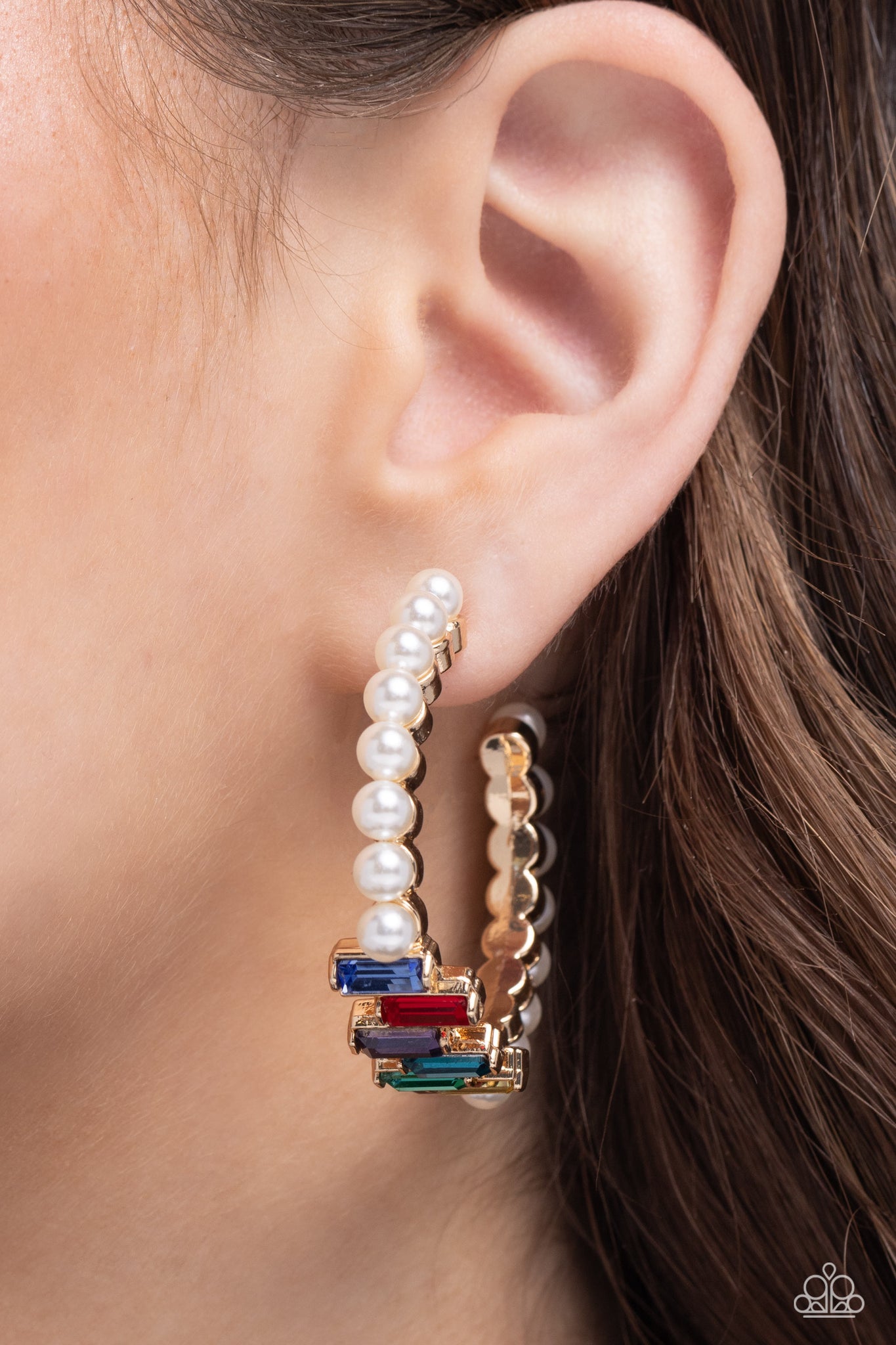 Floating atop sleek silver fittings, a glamorous collection of classic white pearls, interrupted by a collection of staggered multicolored emerald-cut gems, delicately coalesces around a silver hoop for a sparkly statement. Earring attaches to a standard post fitting. Hoop measures approximately 1 3/4" in diameter.