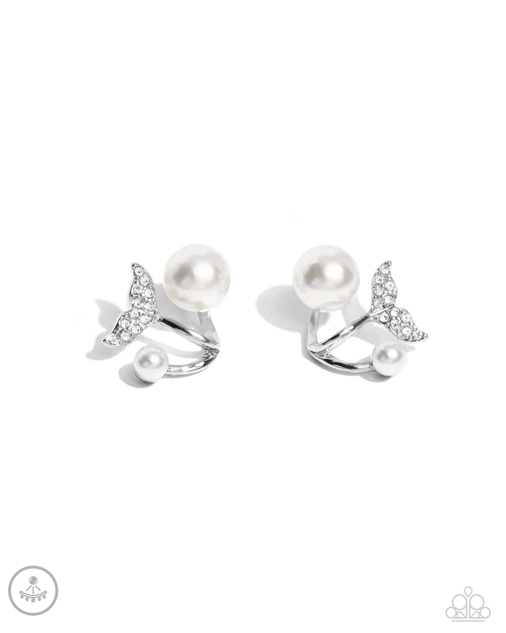 Embellished in white rhinestones, a silver mermaid tail swoops below the ear. Glossy white pearls in varying sizes frame the mermaid tail for additional coastal charm. Earring attaches to a standard post fitting.