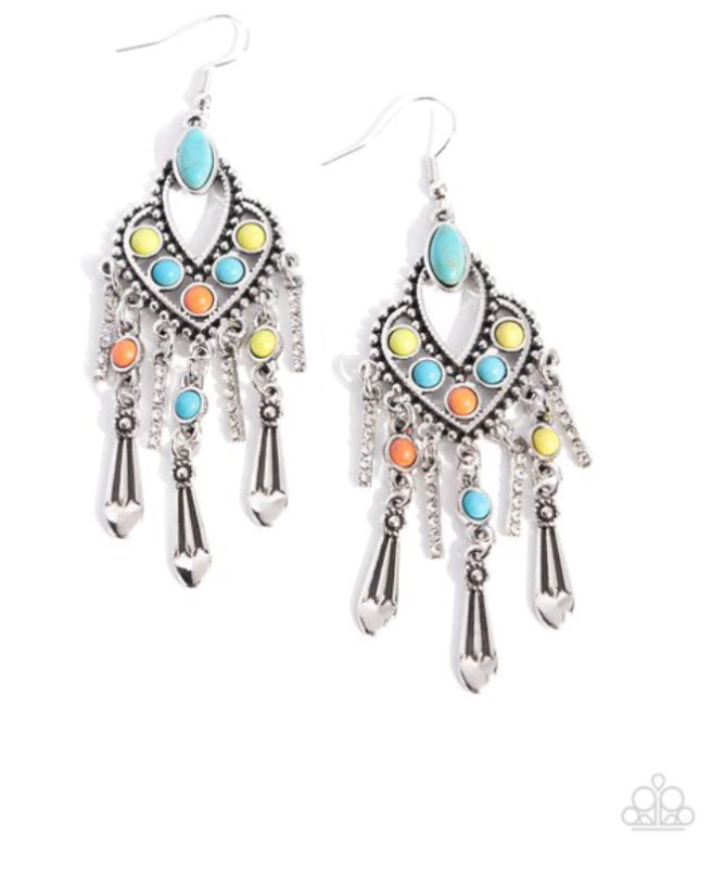 Gradually tapering below the ear, glassy white rhinestones embellish along silver bars while turquoise, orange, and green-beaded flared bars create a dramatic fringe at the bottom of a decorative silver-studded frame swirling with turquoise, orange, and green stones in round and marquise-cuts for an over-the-top earthy lure. Earring attaches to a standard fishhook fitting. As the stone elements in this piece are natural, some color variation is normal.