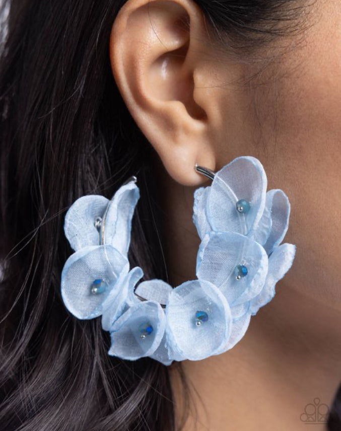 A classy collection of baby pink chiffon flowers with dainty Desert Flower faceted beaded centers are wrapped along the outside curve of a shiny, gold hoop by shimmery gold wire for a whimsical, posh finish. Earring attaches to a standard post fitting. Hoop measures approximately 1 3/4" in diameter.