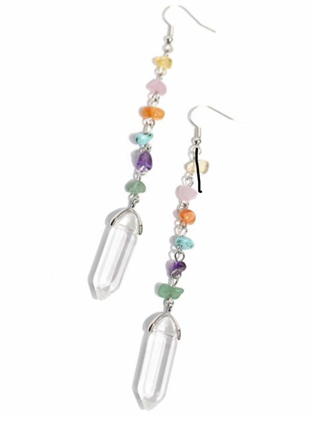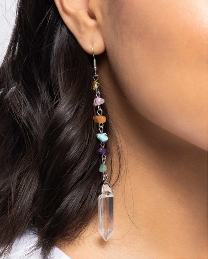Chiseled jade, turquoise, and amethyst stones connect down the ear along a silver chain, leading the eye to a clear quartz-like piece at its end for an elegantly earthy lure. Earring attaches to a standard fishhook fitting. As the stone elements in this piece are natural, some color variation is normal.