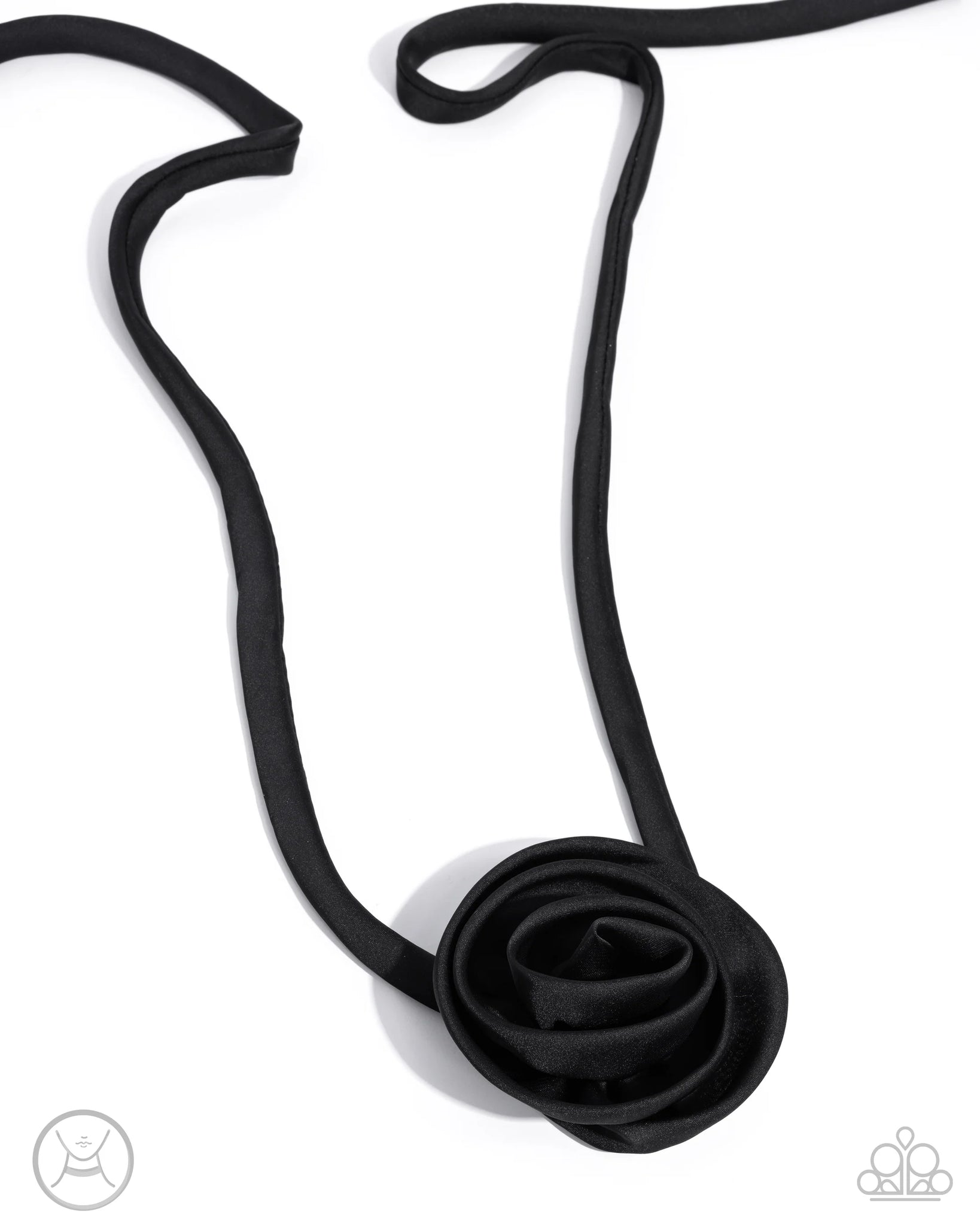 An oversized black silk rosette is centered along a thick black silk strip, creating an elegant floral-inspired centerpiece around the collar. Features a ribbon that can be tied at your desired length.