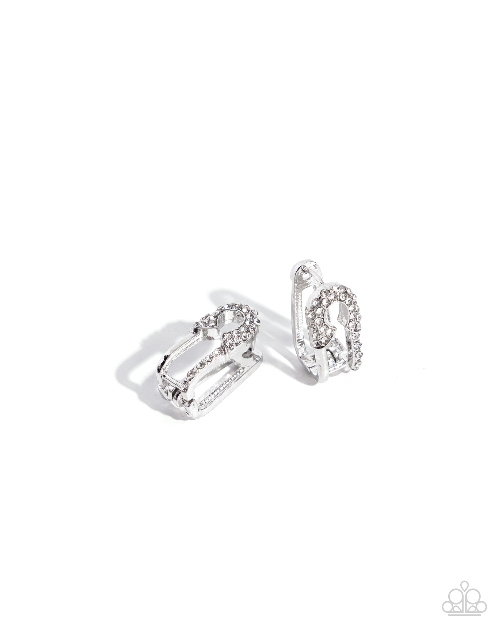 A white rhinestone-embellished silver safety pin curls along the curvature of the ear, creating a surprising hint of edgy elegance. Earring attaches to a standard hinge closure fitting. Hoop measures approximately 1" in diameter.