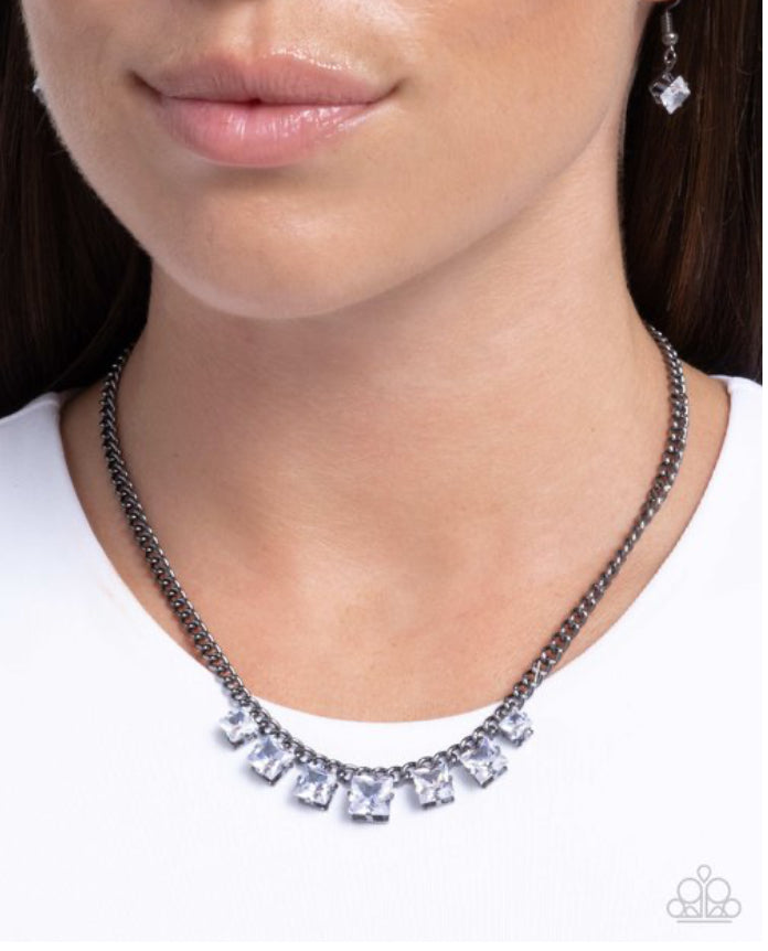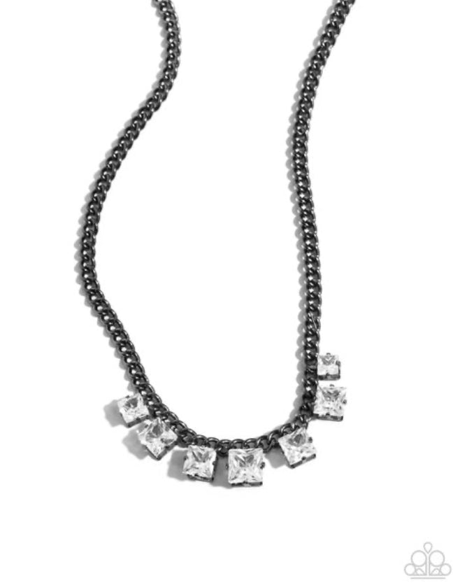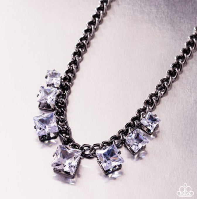 Pressed in elevated gunmetal fittings, faceted white square gems are sporadically sprinkled along a gunmetal curb chain, gradually increasing in size along the center of the neckline, adding a dramatic, dauntless flash of glitz. Features an adjustable clasp closure.