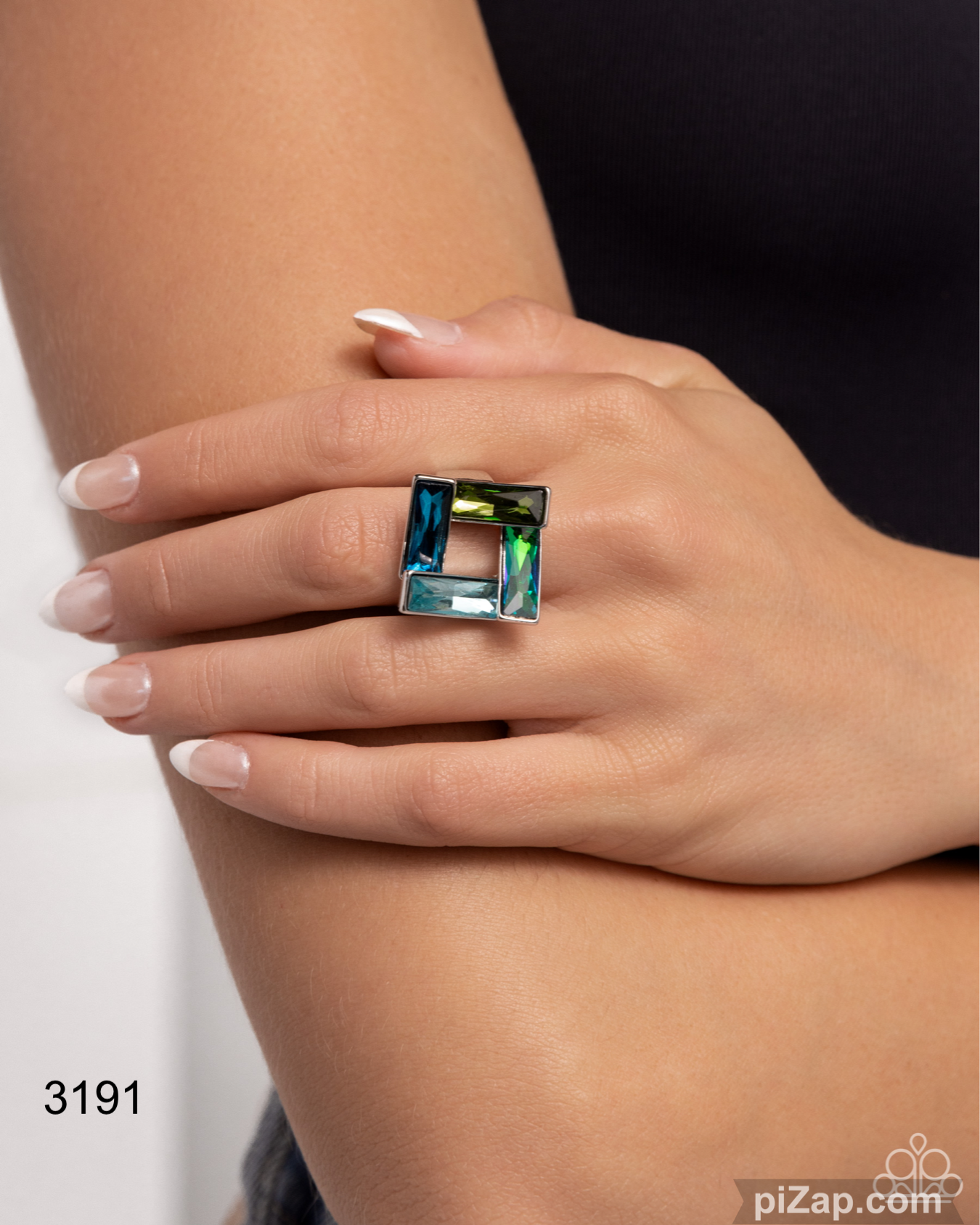 Set in a topsy-turvy silver frame, a collection of blue multicolored emerald-cut gems form into an airy square for a sinuous shimmery centerpiece. Features a stretchy band for a flexible fit.