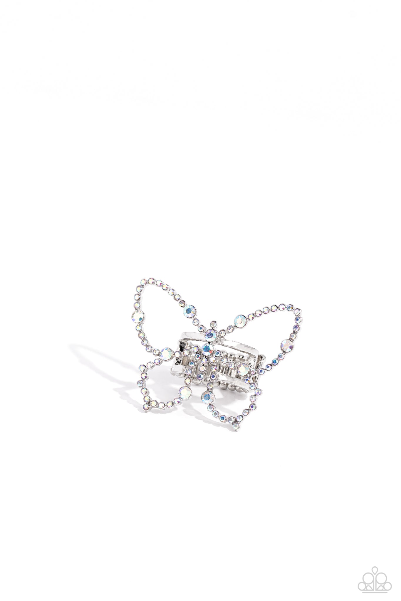 Dotted in iridescent rhinestones, an oversized silver butterfly flutters atop airy silver bands, resulting in a dazzling statement piece. Features a stretchy band for a flexible fit. Due to its prismatic palette, color may vary.