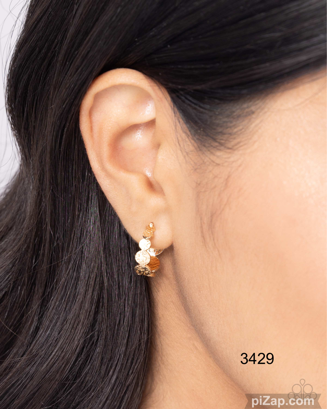 Dainty hammered gold discs curl around the ear for a textured statement. Earring attaches to a standard post fitting. Hoop measures approximately 1/2" in diameter.