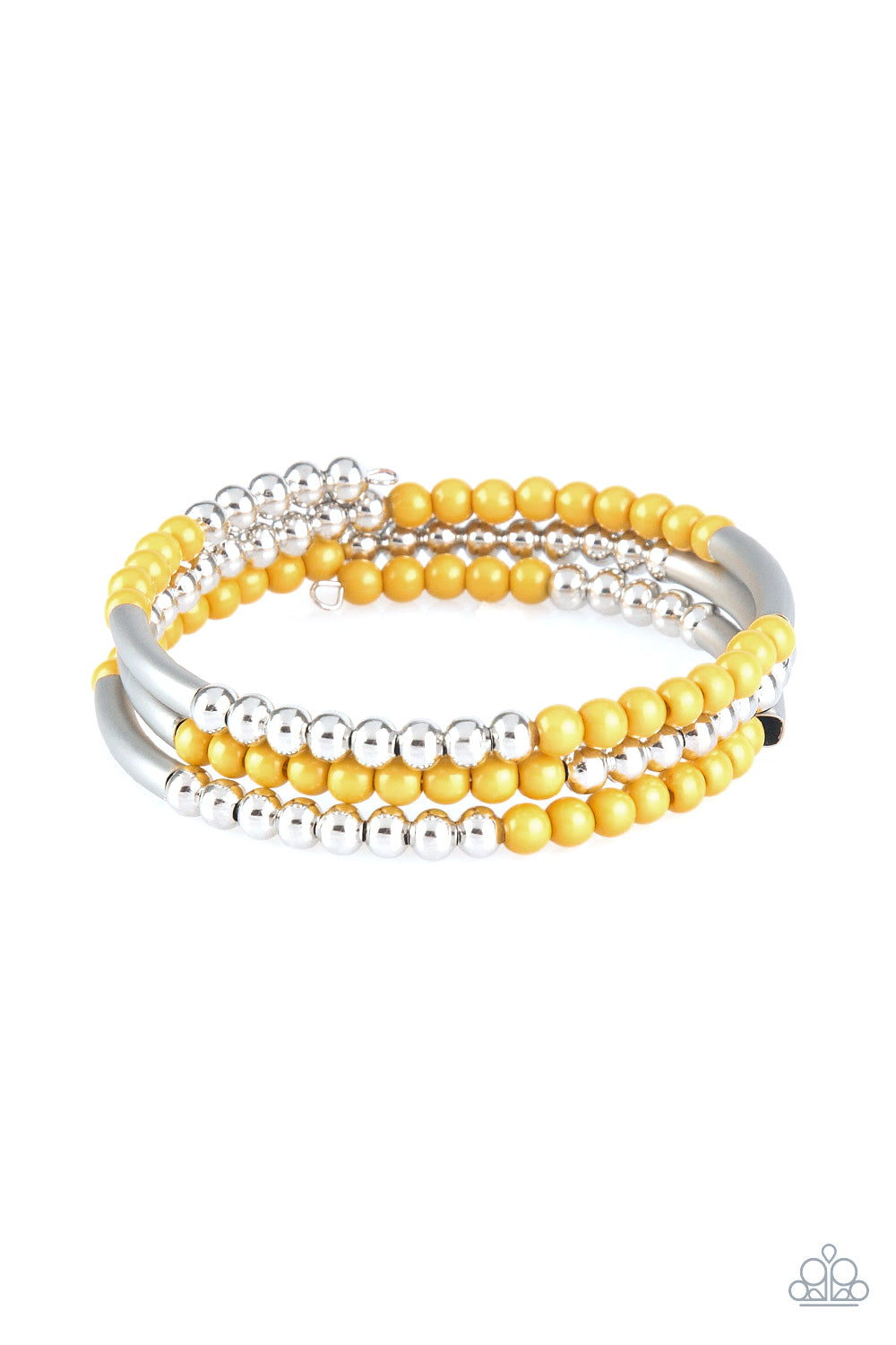 A collection of yellow and shiny silver accents are threaded along a long wire to create an infinity wrap bracelet. Coil design allows for an adjustable fit.