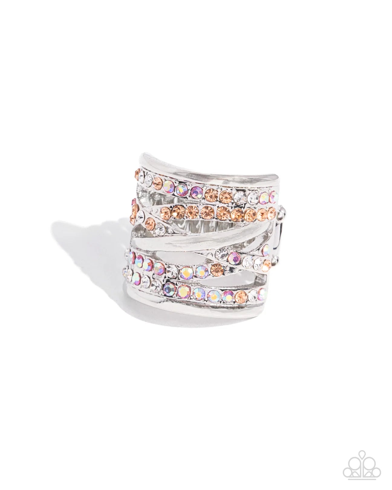 Lined with dainty green and blue multicolored rhinestones, glistening silver bars create the illusion of endless sparkle as they stack and arc across the finger creating a stunning backdrop for the rhinestones, allowing the skin to peek through the airy bands for a whimsical finish. Features a stretchy band for a flexible fit.