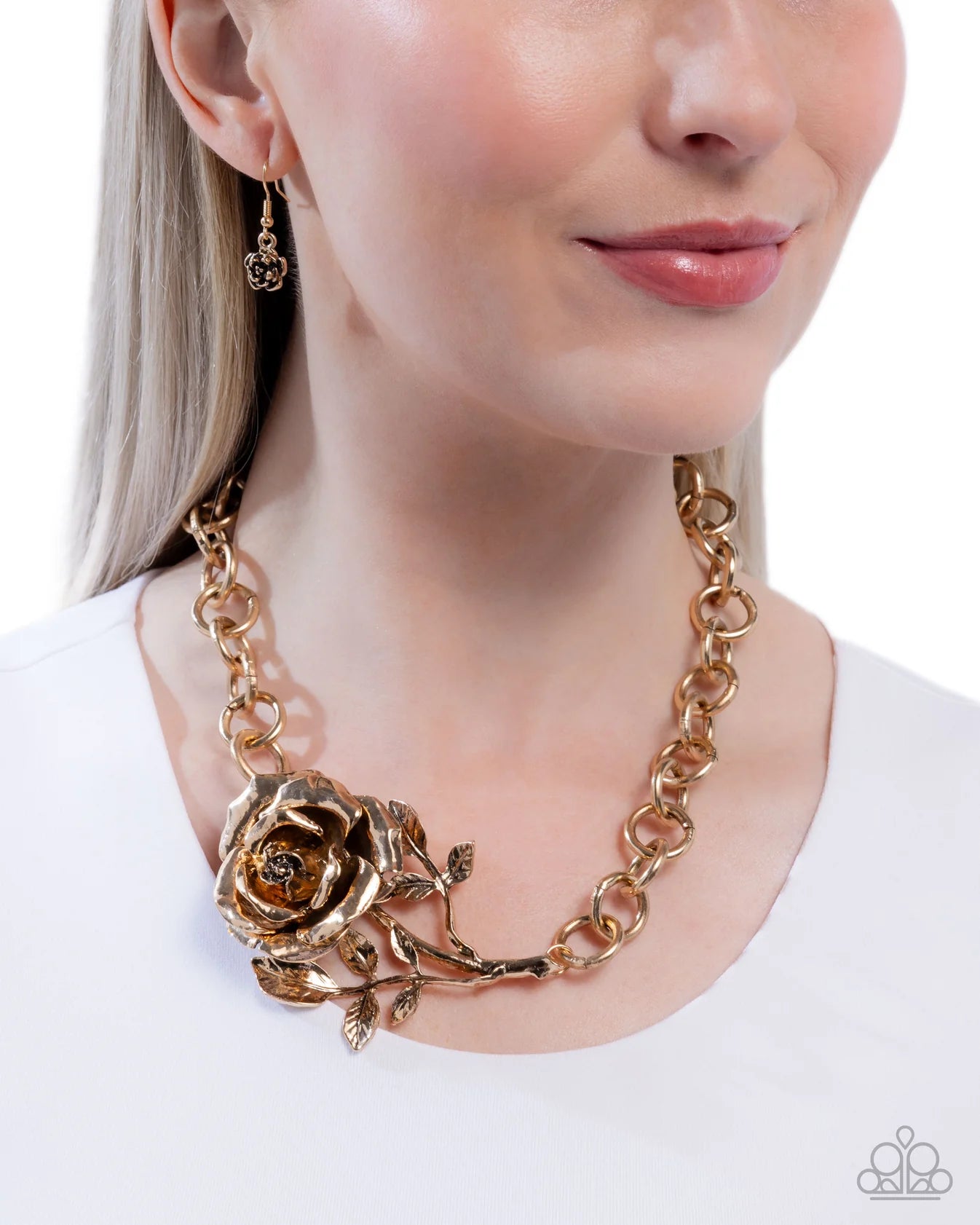 Featuring antiqued gold rings, a lifelike three-dimensional blooming gold rose complete with leaves and a stem is centered below the neckline for an over-the-top whimsical showpiece. Features an adjustable clasp closure.